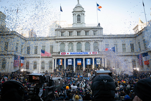 The incoming Mayor told the massive crowd “working people have reckoned with the consequences. Crowded classrooms and public housing developments where the elevators sit out of order; roads littered with potholes and buses that arrive half an hour late, if at all; wages that do not rise and corporations that rip off consumers and employees alike.”