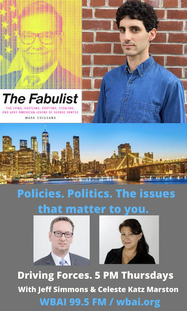 On the November 30 episode of Driving Forces, hosts Celeste Katz Marston and Jeff Simmons explore the future of Congressmember George Santos with Mark Chiusano, author of The Fabulist, The Lying, Hustling, Grifting, Stealing, and Very American Legend of George Santos.